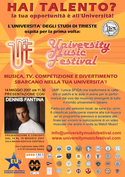 University Music Festival sarà presentato a stampa, tv e studenti all'Università degli Studi di Trieste il 14 maggio 2007 in Piazzale Europa 1, Aula Magna edificio centrale, ore 11.30, con la partecipazione dell'artista Dennis Fantina.